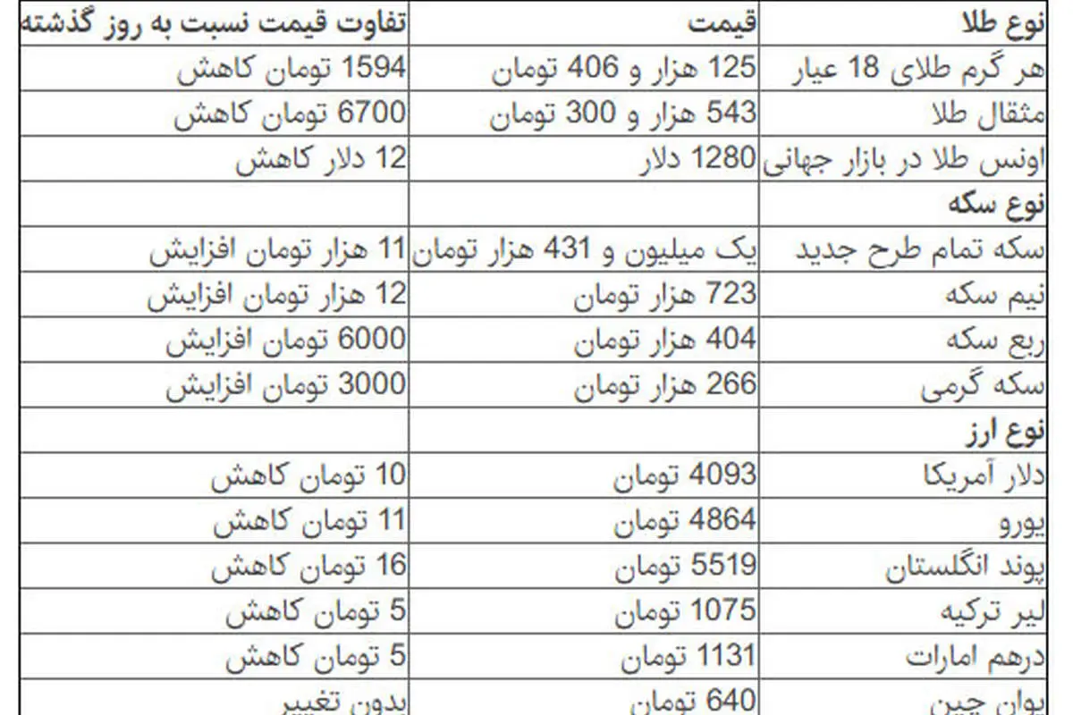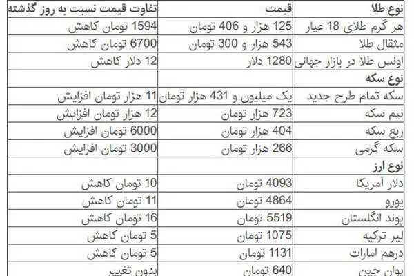 قیمت طلا بر خلاف سکه روند نزولی پیدا کرده است. هر گرم طلای 18 عیار با حدود 1600 تومان کاهش 125 هزار و 406 تومان فروخته میشود. هر مثقال طلا نیز 543 هزار و 300 تومان قیمت دارد و هر اونس طلا در بازار جهانی 1280 دلار داد و ستد میشود.