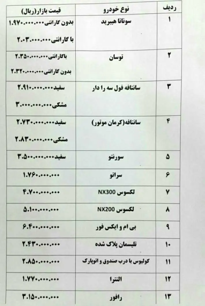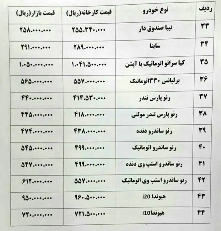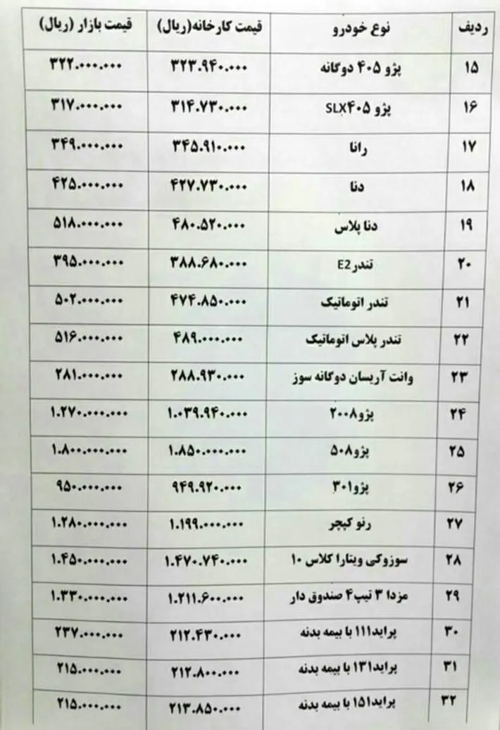 جدول قیمت خودروهای داخلی به شرح زیر است با این توضیح که جدول چهارم متعلق به خودروهای خارجی است: