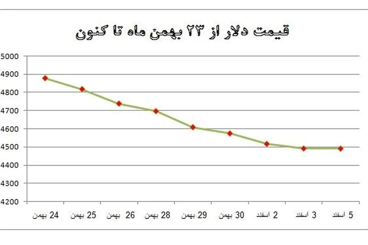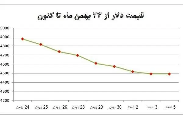 در مورد سایر ارزها نیز این وضعیت وجود دارد . نمودار زیر نشان دهنده وضعیت قیمت ها از بیست و چهارمین روز بهمن تا اولین ساعات امروز است. قیمت در نظر گرفته شده قیمت پایانی بازار در هر روز است . بدیهی است در بسیاری از موراد قیمت هایی بالاتر نیز مبنای خرید و فروش دلار در یک روز بوده است.