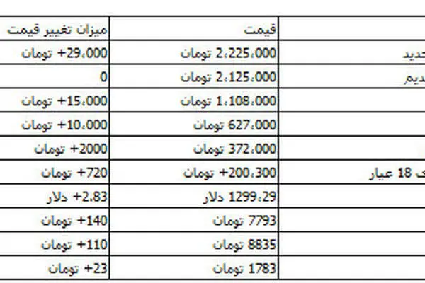 سکه طرح جدید 29 هزار تومان، نیم سکه 15 هزار تومان، ربع سکه 10 هزار تومان، سکه گرمی 2 هزار تومان و هر گرم طلای 18 عیار 720 تومان افزایش قیمت داشت.