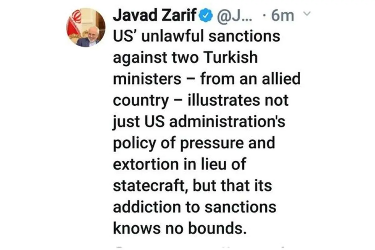 محمد جواد ظریف در توئیتی تحریم آمریکا علیه ترکیه را محکوم کرد.
