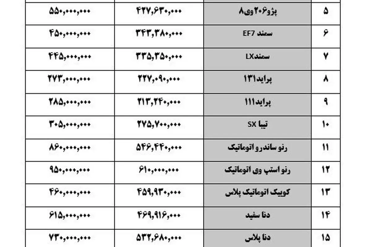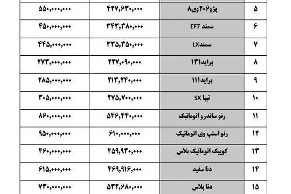 قیمت خودرو در بازار امروز بهشرح زیر است: