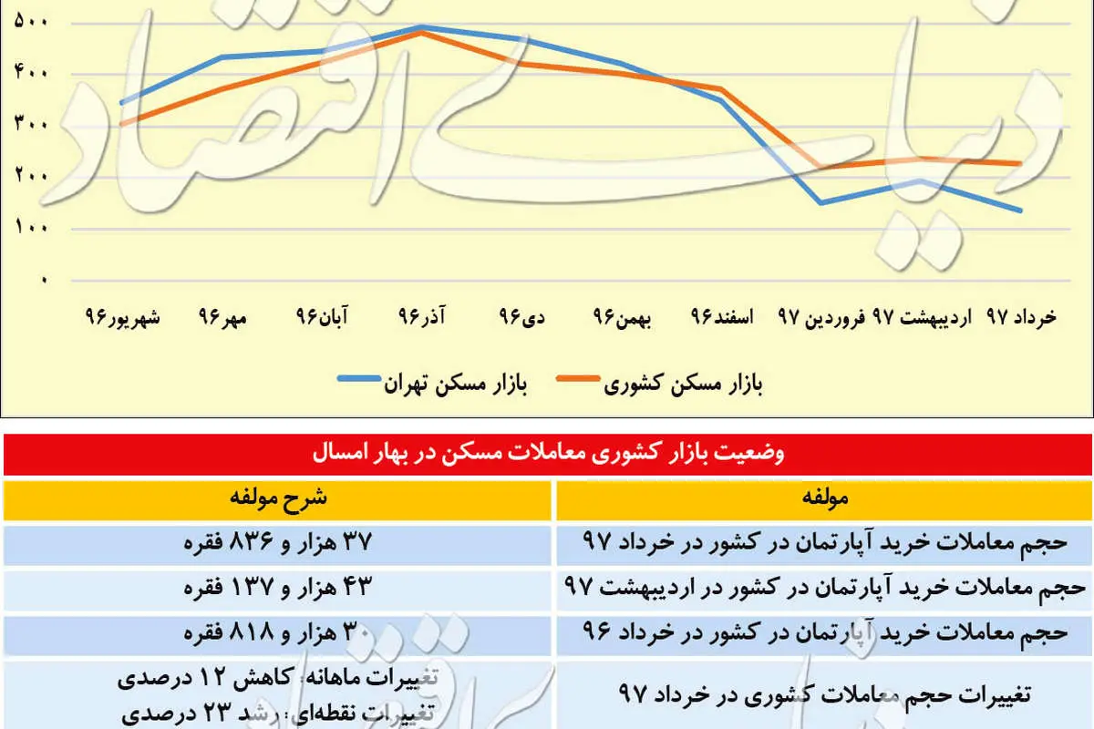سرایت جهش قیمت مسکن شهر تهران به سایر شهرها منجر به افت حجم خرید و فروش آپارتمان و سکته سراسری معاملات ملک در کشور شد. برآوردهای «دنیای اقتصاد» از اطلاعات مربوط به آمار اولیه گزارش رسمی تحولات بازار مسکن در بهار ۹۷ و همچنین نتایج تحقیقات میدانی به عمل آمده نشان میدهد، بازار کشوری معاملات مسکن اگرچه از ابتدای امسال با یک فصل تاخیر در مقایسه با تهران، وارد فاز رونق شد، اما در خرداد ماه افت ماهانه ۱۰ درصدی حجم معاملات خرید را تجربه کرد.