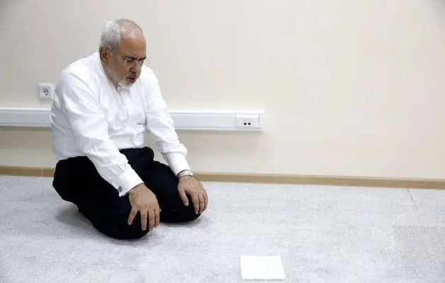 در حاشیه اجلاس محمد جواد ظریف، وزیر امور خارجه و جمعی از هیات ایرانی در حال سجده بر روی کاغذ دیده میشوند.