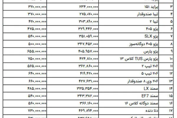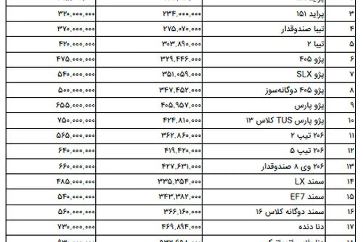 همچنین ۲۰۶ تیپ ۵ با کاهش ۲ و نیم میلیون تومانی نسبت به روز گذشته در بازار امروز تهران به قیمت ۶۴ میلیون تومان معامله شد، قیمت دنا هم با کاهش ۲ میلیون تومانی از ۷۵ میلیون تومان به ۷۳ میلیون تومان رسید.