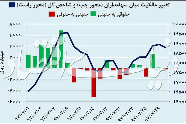 بررسی عملکرد دو دسته از معاملهگران حقیقی و حقوقی در ماه گذشته نشان میدهد که مشارکت سهامداران حقیقی در مهرماه نسبت به شهریورماه افزایش اندکی را تجربه کرده است. در عین حال حقوقیها در سمت خرید نسبت به دادوستد شهریورماه فعالتر شدند. بررسیها نشان میدهد مشارکت ۲۶ درصدی سهامداران عمده در شهریورماه، در ماه گذشته به ۳۳ درصد افزایش یافت. این درحالی است که خالص تغییر مالکیت در این ماه به نفع سهامداران حقیقی رقم خورد. بیشترین توجه سهامداران حقیقی در معاملات این ماه به صنعت بانک اختصاص داشت. این صنعت در این بازه زمانی خالص تغییر مالکیت ۳۸۴ میلیارد تومانی را به ثبت رساند.