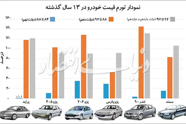 با در نظر گرفتن سال ۸۴ بهعنوان سال پایه، مشخص میشود در حال حاضر قیمت خودروهای داخلی در بازار آزاد، بین ۳۰۰ تا ۵۰۰ درصد نسبت به آن مقطع رشد داشته است. این در شرایطی است که اگر سال پایه را ۹۲ لحاظ کنیم، رشد قیمتها در سال ۹۷ و نسبت به مقطع موردنظر، حداکثر ۱۳۳ درصد بوده است. طبق بررسی انجامشده، در بین خودروهای داخلی، تندر-۹۰ بیشترین تورم را در بازه زمانی ۹۲ تا ۹۷ داشته است؛ بهنحویکه حدود ۱۳۳ درصد افزایش قیمت را به خود میبیند. پس از تندر، پراید افزایش قیمتی ۱۲۲ درصدی در سال ۹۷ و نسبت به سال ۹۲ داشته و درصد تغییر قیمت تیبا هم حدود ۱۰۰ درصد است.