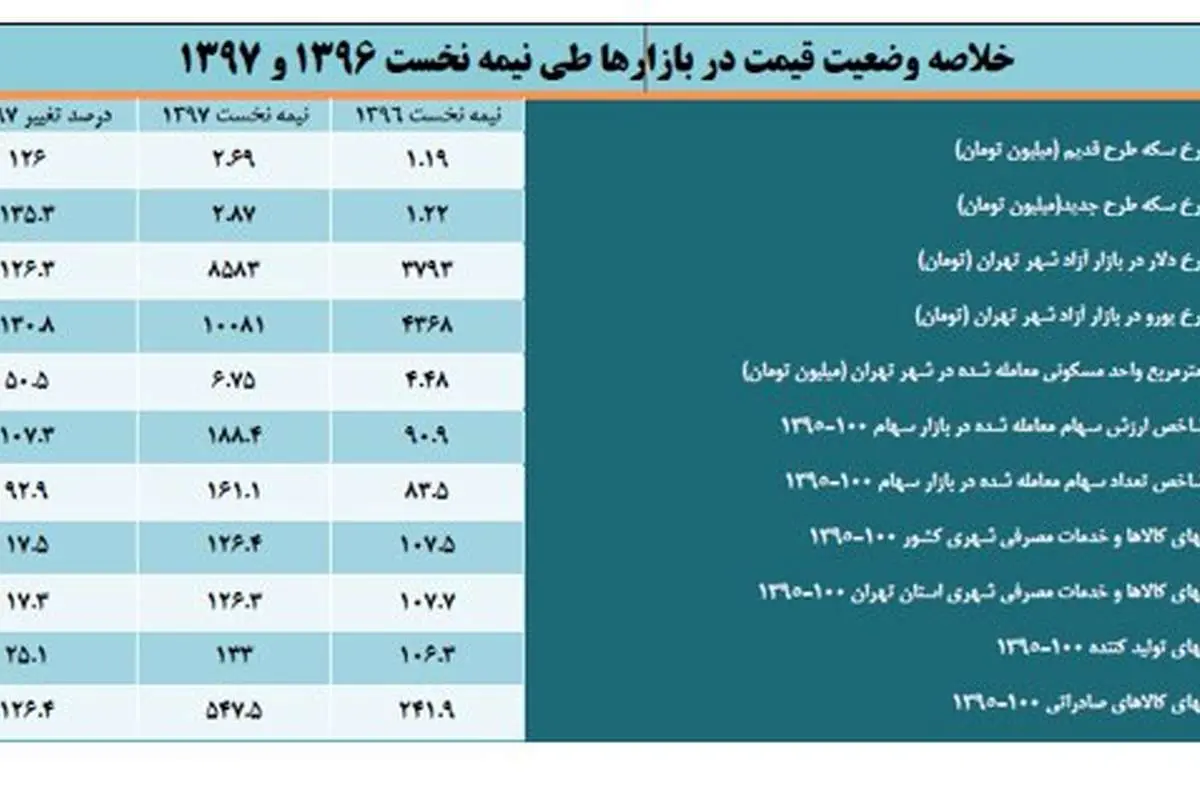 نکته حائز اهمیت تغییرات بازارهای مختلف در مقایسه سال جاری با سال گذشته است که میتواند شرایط مناسبی را برای تحلیل به بسیاری از سیاستگذاران و حتی مردم بدهد. آنگونه که آمار بانک مرکزی نشان میدهد، نرخ دلار در نیمه نخست سال ۹۷ نسبت به نیمه نخست سال ۹۶ چیزی حدود ۱۲۶ درصد و نرخ یورو در این مدت ۱۳۰ درصد افزایش داشته است.