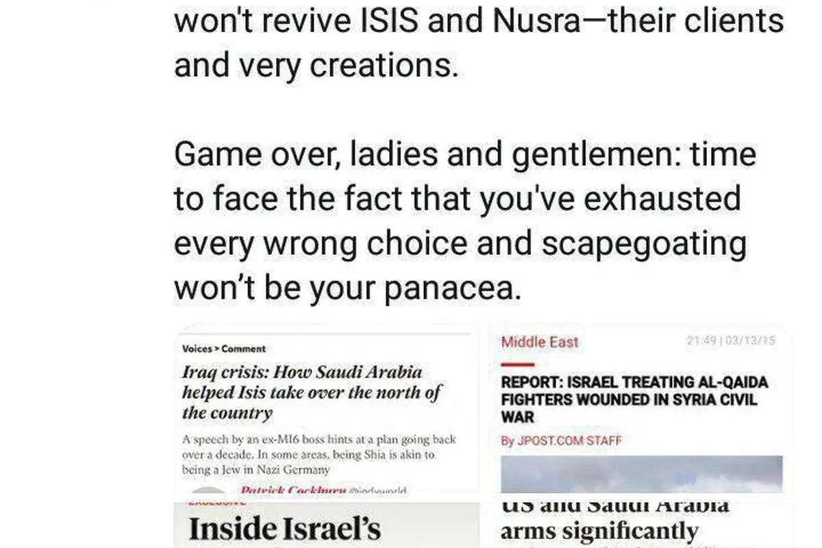 وی با انتشار تصاویری از گزارشهای رسانهای که نشان میدهد رژیم صهیونیستی، آمریکا و عربستان سعودی از القاعده و داعش حمایت کردهاند، در توییتر نوشت: «بازندگان جنگ منطقه ما علیه ترور نمیتوانند تاریخ را پاک کنند. هدف قرار دادن سپاه پاسداران انقلاب اسلامی داعش و النصره، یعنی مشتریان و مخلوقین [بازندگان منطقه] را احیا نخواهد کرد.»