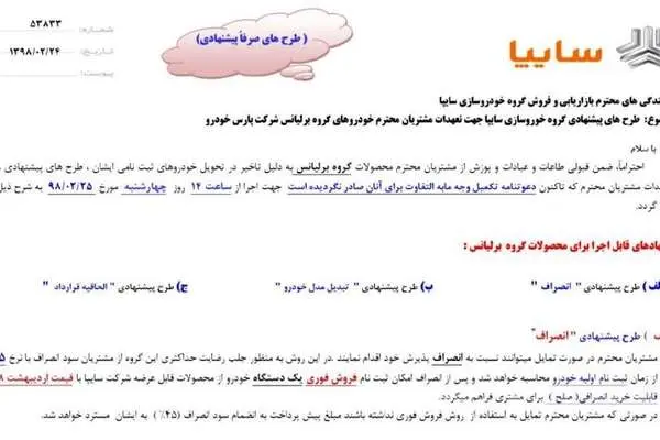 به گزارش خبرآنلاین شرکت سایپا صبح امروز با ارسال بخشنامه‌ای به نمایندگی‌های فروش و مشتریانی که خودروی برلیانس ثبت نام کرده اند می‌توانند یکی از ۳ راهکار پیشنهاد شده را انتخاب کنند. زمان اجرای این پیشنهادها از ساعت ۱۴ فردا(چهارشنبه) تا ۱۳ خردادماه است.