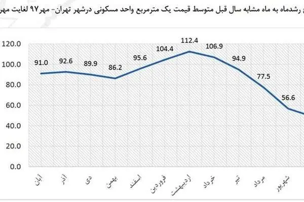 نمودار زیر از نوسانات ۱۲ ماهه قیمت مسکن شهر تهران نشان میدهد که روند رشد سالیانه قیمت، نزولی است. بعد از آنکه اردیبهشت امسال بازار مسکن شهر تهران به بالاترین میزان افزایش سالیانه قیمت به میزان ۱۱۲ درصد رسید، مهرماه امسال این نرخ به ۴۸ درصد کاهش یافته و نمودار از اردیبهشت ماه به بعد نزولی شده است.