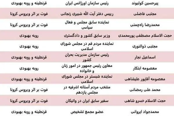 به گزارش فارس، در بالا جدول وضعیت برخی مقامات مبتلا به کرونا قابل مشاهده است.