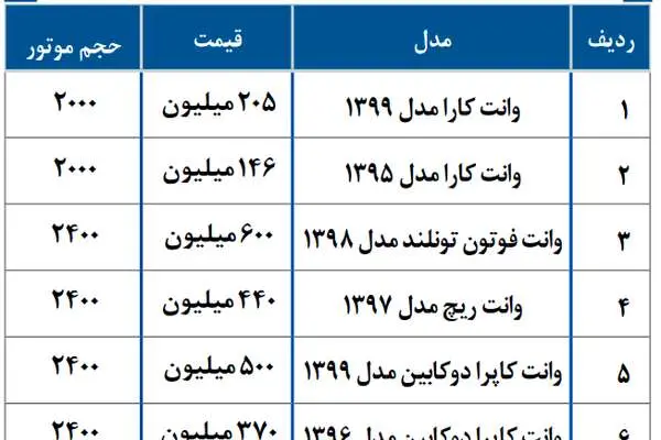 قیمت وانت دو کابین امروز شنبه ۲۲ آذر ۹۹ را در جدول زیر مشاهده کنید.