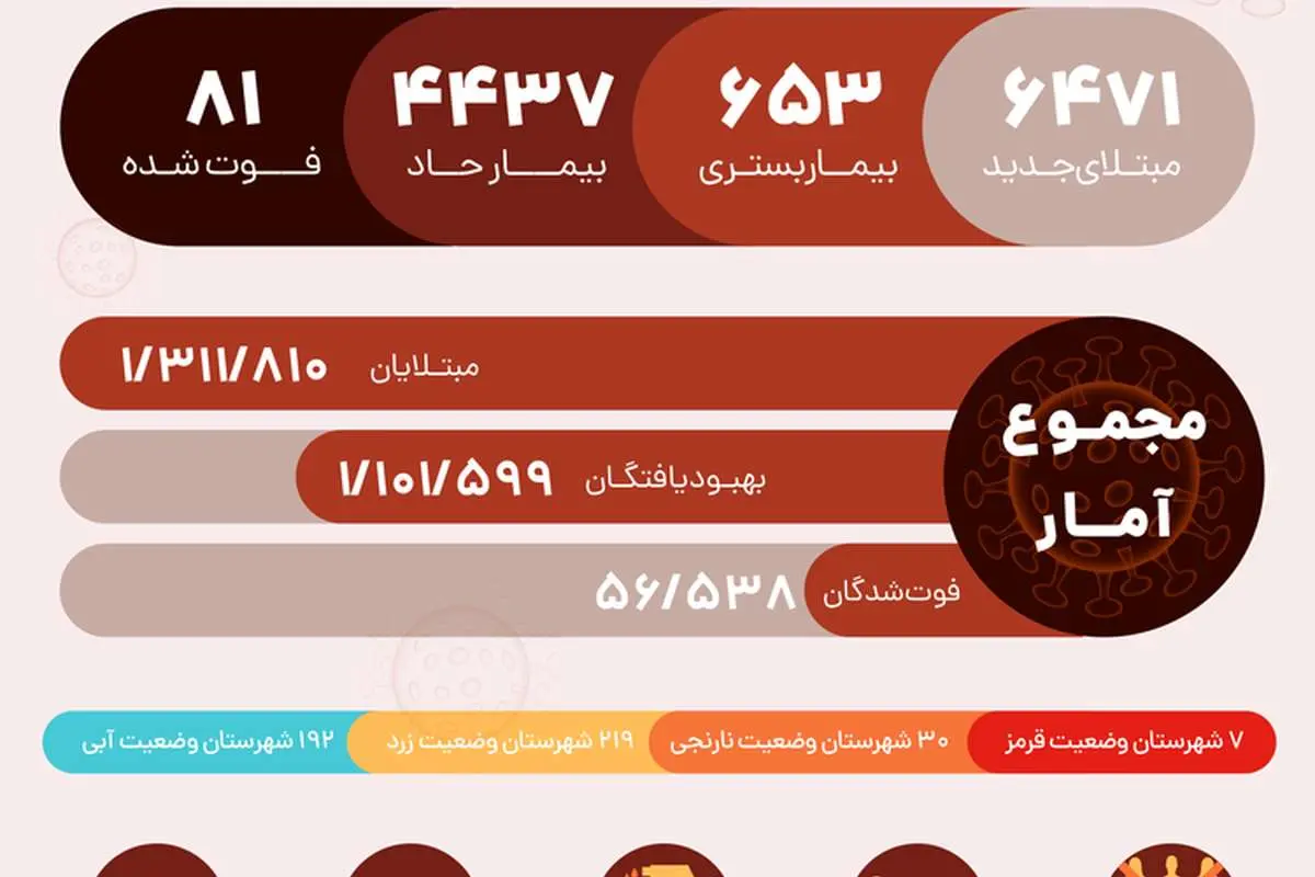 لاری افزود: متأسفانه در طول ۲۴ ساعت گذشته، ۸۱ بیمار کووید ۱۹ جان خود را از دست دادند و مجموع جانباختگان به ۵۶ هزار و ۵۳۸ نفر رسید.