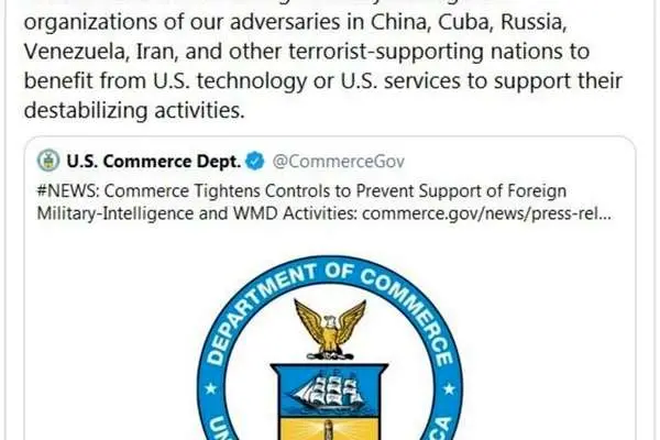 وزارت بازرگانی آمریکا با صدور دو دستورالعمل دولتی اعلام کرد موازین نظارتی جدیدی را برای کنترل انتقال فنآوریها و فعالیتهای افرادی که ممکن است با سرویسهای نظامی خارجی همکاری کنند، وضع میکند.