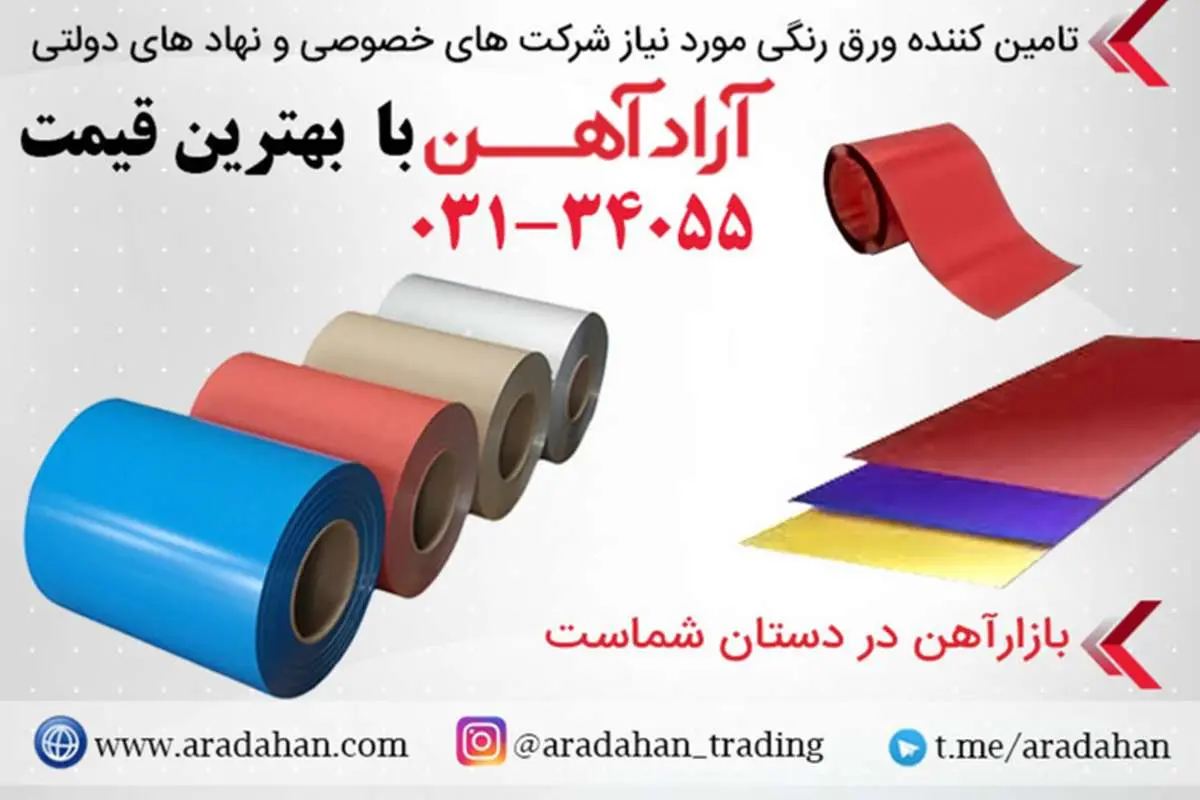 همانطور که اشاره شد ورق های رنگی جز پرکاربردترین ورق ها در صنایع مختلف می باشند. نوسانات بازار آهن در قیمت ورق رنگی موثر است. شما می توانید برای خرید ورق رنگی کارخانجات معروفی چون ورق رنگی فولاد مبارکه، ورق رنگی هفت الماس و سایر مجتمع های فولادی با بهترین قیمت با کارشناسان آراد آهن با شماره 34055-031 تماس بگیرید. مجموعه آراد آهن بهترین قیمت ورق رنگی فولاد مبارکه و سایر مجتمع های فولادی را به صورت روزانه در سایت و کانال تلگرام خود درج میکند که به شما در انجام خریدی بهتر کمک می کند.
