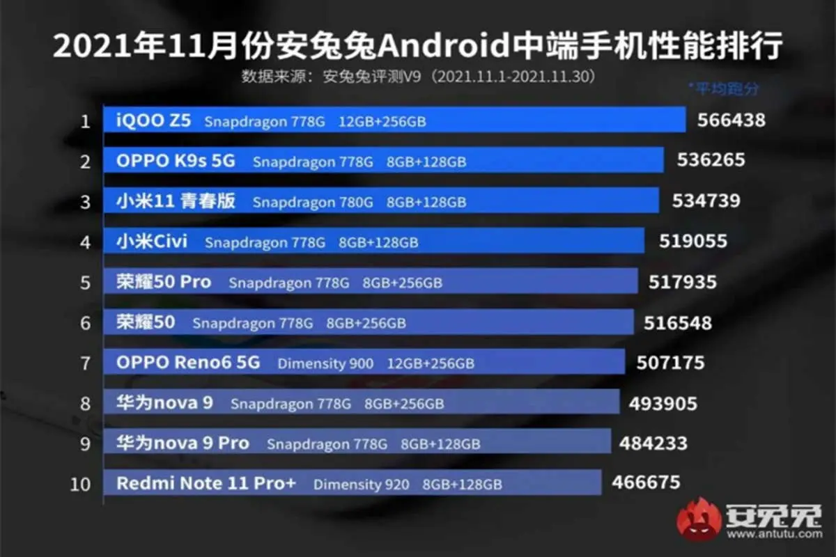 رتبههای اول تا ششم لیست Antutu، عبارتند از iQOO Z۵ با ۵۶۶۴۳۸ امتیاز، OPPO K۹s ۵G با ۵۳۶۲۶۵ امتیاز، Xiaomi Mi ۱۱ Lite ۵G با ۵۳۴۷۳۹ امتیاز، Xiaomi Civi با ۵۱۹۰۵۵ امتیاز، Honor ۵۰ Pro با ۵۱۷۹۳۵ امتیاز و Honor ۵۰ با ۵۱۶۵۴۸ امتیاز. تمام این شش گوشی مجهز به Snapdargon ۷۷۸G هستند.
