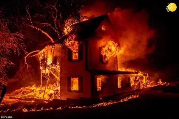 ۱۶ اوت ۲۰۲۱، خانهای در شعلههای آتش در شمال کالیفرنیا.