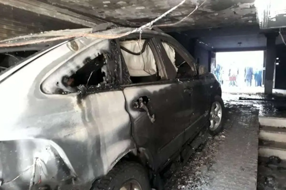 در قسمت همکف و پارکینگ آن یک دستگاه خودروی سواری شاسی بلند و ۵ دستگاه موتورسیکلت و مقدار زیادی ضایعات که در همان بخش دپو شده بود شعله ور شده بودند، شعله از طبقه هم کف بیرون میرفت و در حال سرایت به بالکنها و طبقات بالا بود. دود زیادی نیز به طبقات رفته بود.