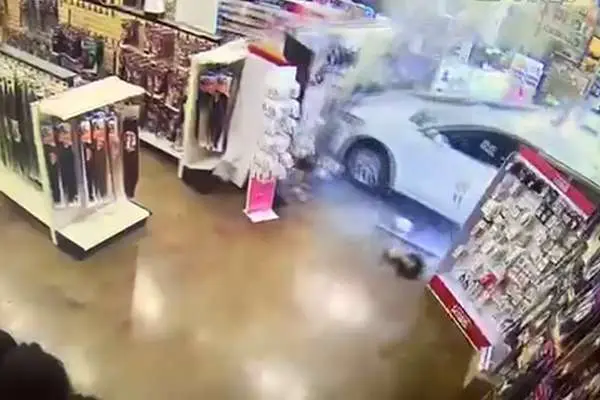 این فیلم دوربین مداربسته لحظه ورود یک خودرو به وسط سالن زیبایی در آریزونا را نشان میدهد که با دو نفر از کارکنان برخورد میکند. به طور معجزه آسایی، هر دو تنها با جراحات جزئی جان سالم به در بردند. به گزارش رسانههای محلی، راننده ناخواسته به جای ترمز پا روی پدال گاز گذاشته که منجر به برخورد شد.