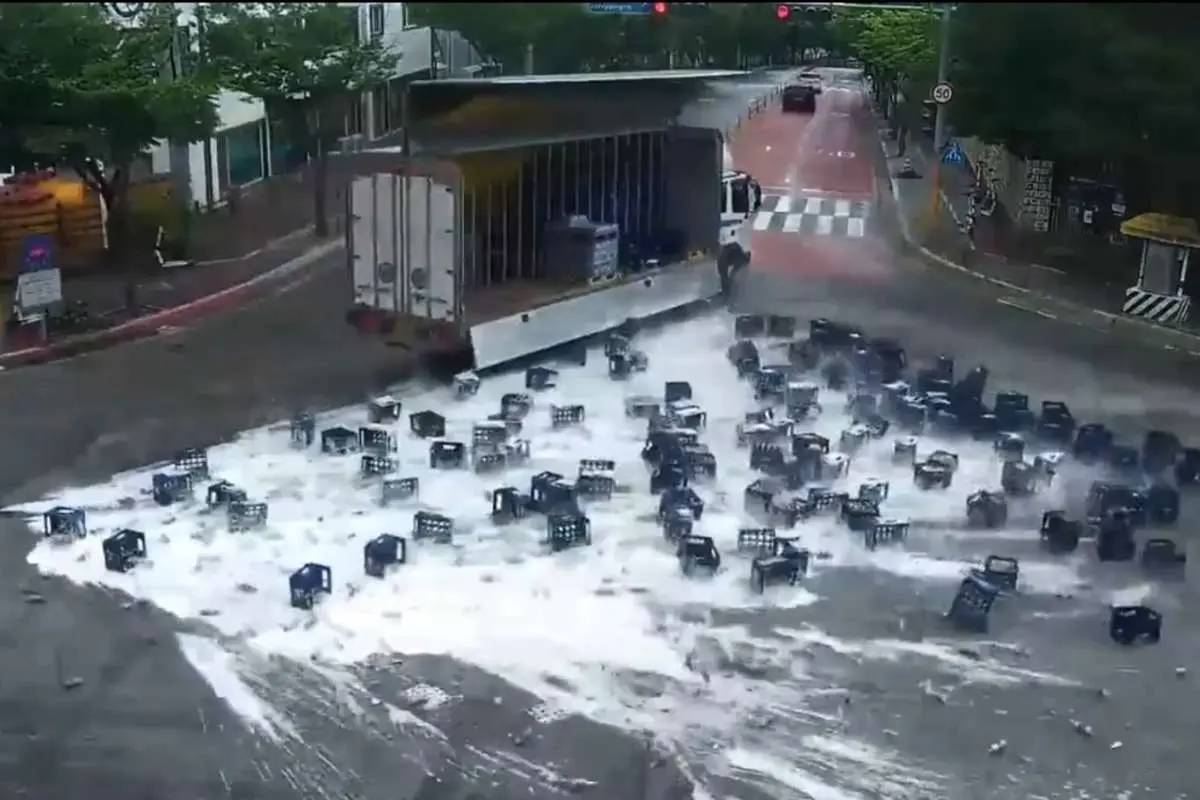 کامیونی که دو هزار بطری نوشیدنی را حمل می کرد با حادثه ای روبرو شد که کل جعبه را روی جاده ریخت.