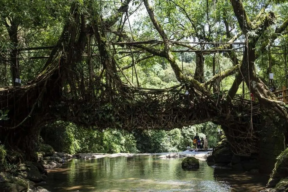 در ایالت مگالایا هند، پلهای ریشهای زنده که با شکلگیری مجدد ریشههای بالایی درخت کائوچو یا درخت لاستیک ایجاد شده و به عنوان یک پل معلق طبیعی عمل میکند، توجه بازدیدکنندگان داخلی و خارجی را به خود جلب میکند. یکی از این پلها در فهرست میراث جهانی یونسکو قرار گرفته است.