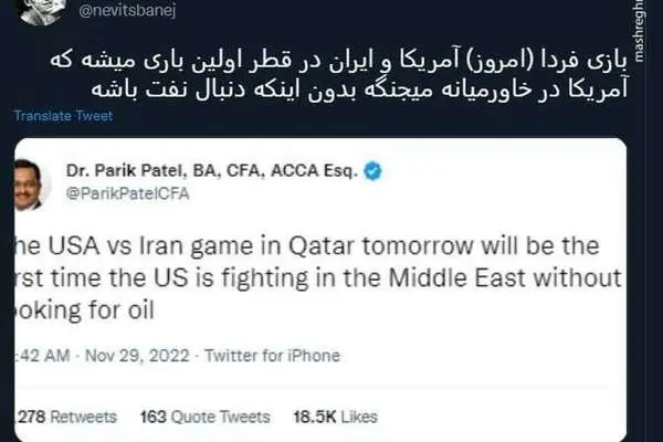 کاربری طی توئیتی نوشت: بازی فردا (امروز) آمریکا و ایران در قطر اولین باری میشه که آمریکا در خاورمیانه میجنگه بدون اینکه دنبال نفت باشه