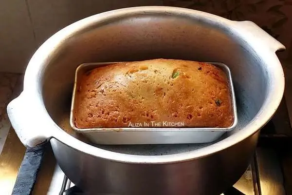 ۵- بعد از سپری شدن ۴۰ دقیقه میتوانید در قابلمه را بردارید و وضعیت کیک را بررسی کنید.