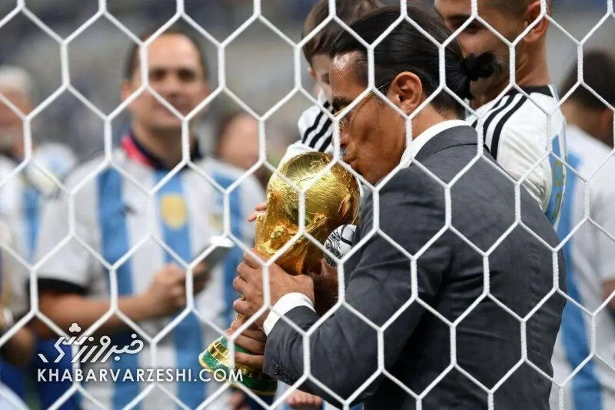 سرآشپز معروف علاوه بر حضور در زمین، جام قهرمانی را لمس کرد و با آن عکس گرفت. این در حالی است که غیر از بازیکنان و کادرفنی تیم قهرمان، کسی حق دست زدن به جام را ندارد.