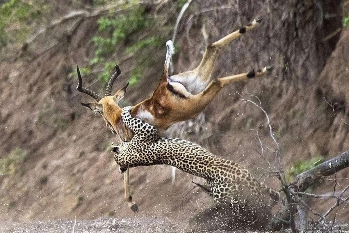 پلنگ هوشمندانه از ساحل رودخانه و بوتهها استفاده کرد تا خود را پنهان کند و به فاصله چند متری ایمپالا نزدیک شد و در آنجا با حمله به یک ایمپالا این حیوان را در هوا گرفت.