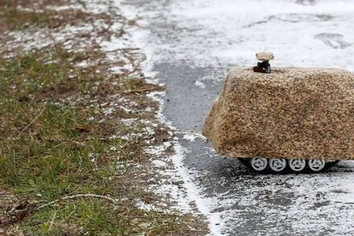 در زیر برف ملایمی که در حال بارش است، سربازی یک سنگ را روی زمین میگذارد. چند لحظه بعد سنگ شروع به حرکت میکند. ابتدا دوربینی که بیشتر شبیه تلسکوپ است از آن بیرون میآید و سپس کل سنگ کمی از زمین فاصله میگیرد و مجموعه کوچکی از ردیابها آشکار میشوند. این سنگ که در واقع رباتی کوچک است، مانند یک تانک روی خاکریزهای یخ زده پیاده نظام حرکت میکند و بالا و پایین میرود. به محض اینکه این سنگ در جای مناسب خود قرار گرفت، بدنه سنگ پایین میآید و تنها دوربین آن بیرون میماند تا اطراف را زیر نظر بگیرد.