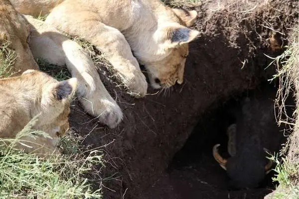 یک شیر گرسنه که لانه گرازها را پیدا کرده بود، اقدام به کندن لانه کرد تا گرازها را بیرون بکشد. در نهایت گرازها پا به فرار گذاشتند و شیر موفق شد یکی از تولهها را شکار کند.