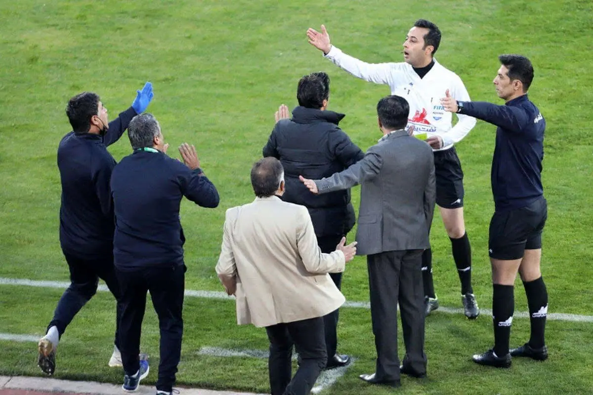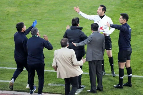 اعتراض کادر استقلال به تیم داوری پس از سوت پایان نیمه اول دربی