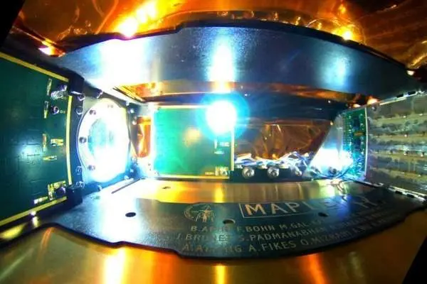 تصویری از داخل MAPLE که آرایه فرستندهها را در سمت راست و گیرنده را در سمت چپ نشان میدهد