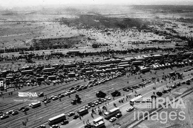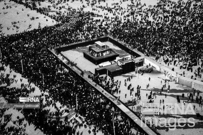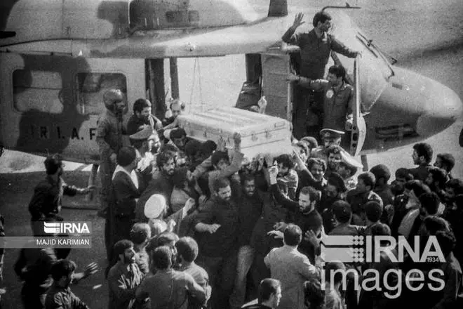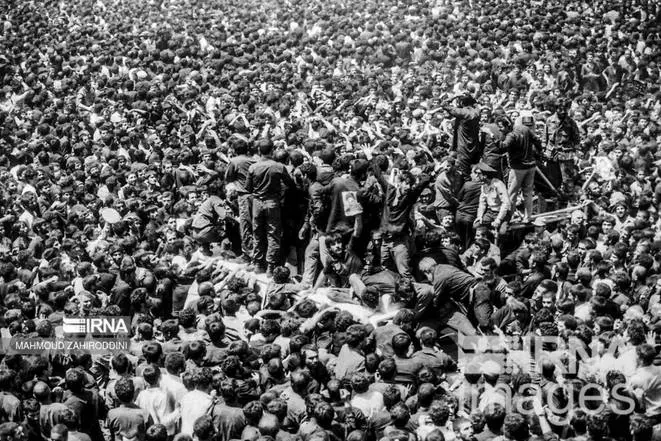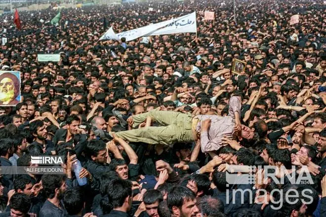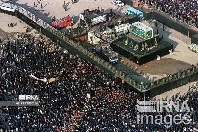 پس از رحلت پیکر امام خمینی جهت وداع در روز ۱۵ خرداد ۱۳۶۸ به مصلای تهران منتقل شد، یخچال بزرگی با دیوارهای شیشهای بر روی چند کانتینر بهطوری قرار گرفت تا مردم بتوانند پیکر امامشان که عمامهای سیاه به نشانه انتساب به سادات بر روی سینه داشت را ببینند. پس از اقامه نماز ابتدا تصمیم گرفته شد برای تشییع کامیونی تابوت حامل پیکر را به بهشت زهرا که در ۲۰ کیلومتری مصلا بود منتقل کند و یک هلی کوپتر از آغاز مسیر تابوت را همراهی میکرد، در میانه راه به علت هجوم جمعیت زیادی که برای تشییع پیکر آمده بودند ادامه دادن مسیر غیر ممکن شد و هلی کوپتر به زحمت به زمین نشست و پیکر برای تکفین مجدد به جماران و در رور بعد به محل تدفین منتقل شد. در یازدهم ژوئن ۱۹۸۹، یک ششم جمعیت وقت ایران (بیش از ده میلیون نفر)، جمعیتی به وسعت ۳۲ کیلومتر برای تشییع پیکر امام خمینی به حوالی بهشت زهرا آمدند تا این بدرقه بزرگترین مراسم تشییع دنیا لقب بگیرد. بخشی از عکسهای زیر از مجموعه آرشیو خبرگزاری ایرنا از مراسمات پس از رحلت رهبر کبیر انقلاب در سال ۱۳۶۸ است که برای اولین بار منتشر میشود.