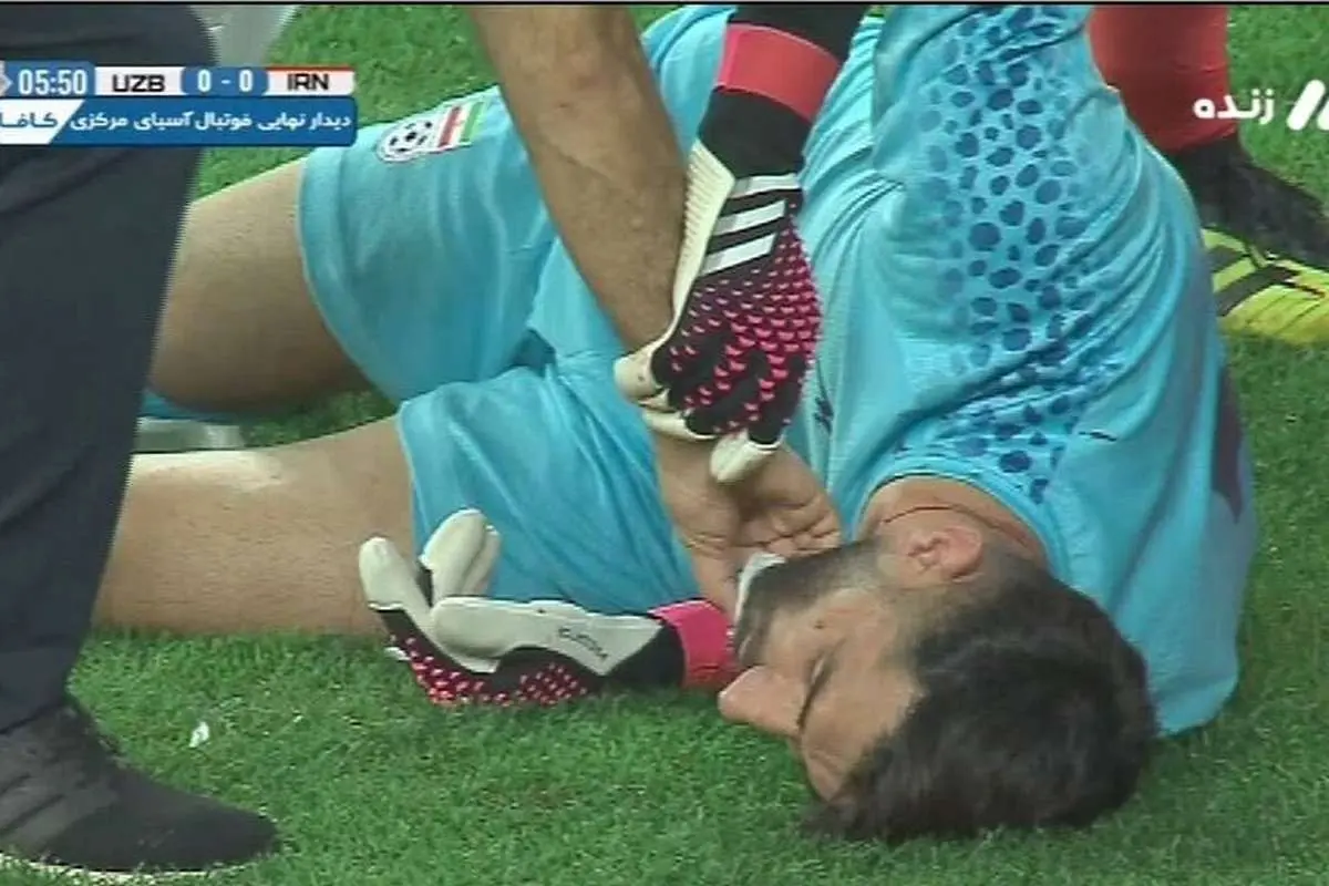 برخورد سنگین بیرانوند و عزتاللهی که منجر به مصدومیت شدید هر دو بازیکن و تعویض بیرانوند با نیازمند شد.