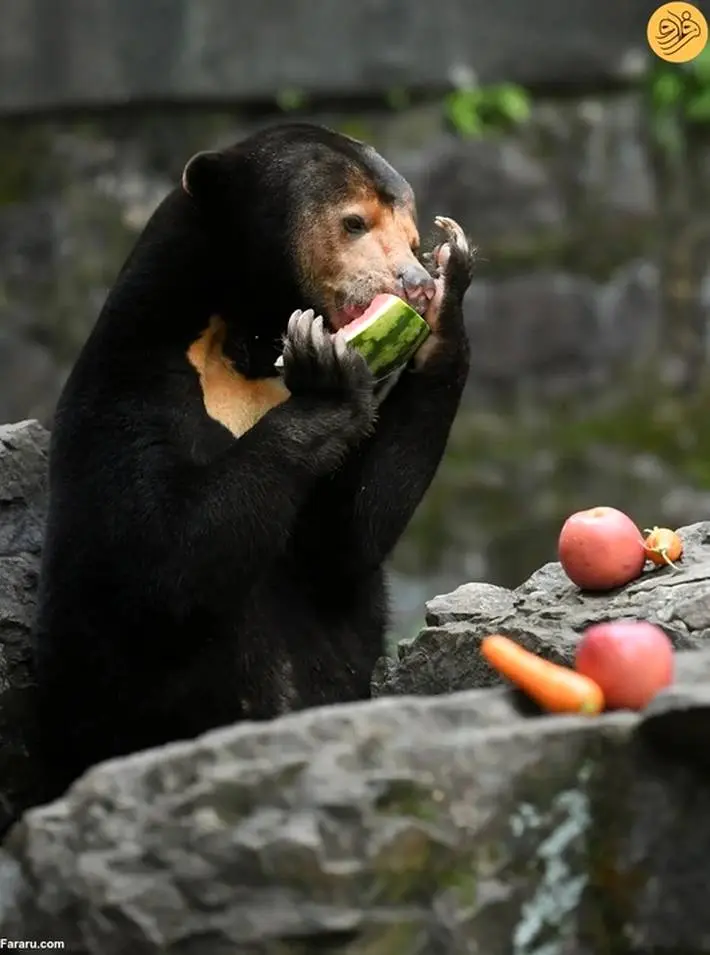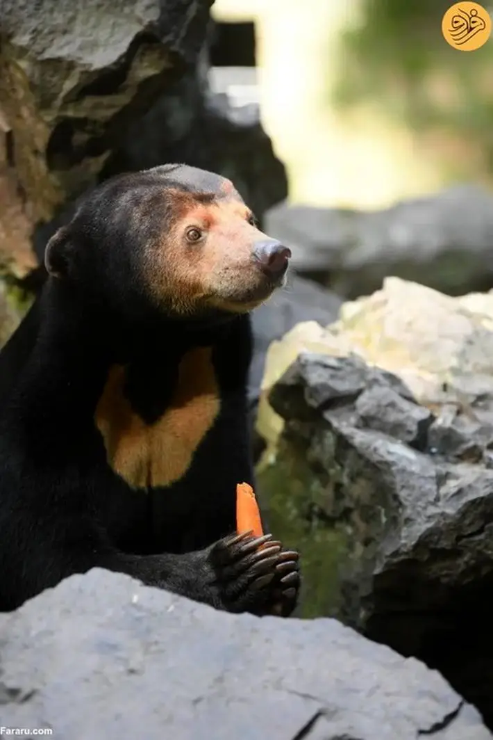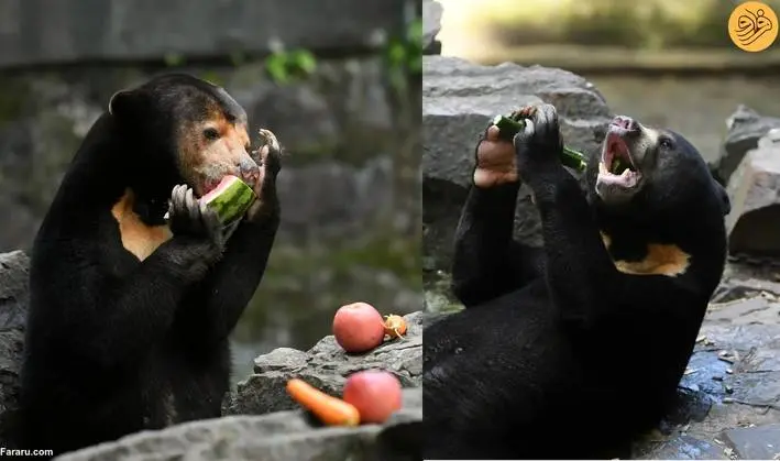 به گزارش فرارو، در یک عکس، این خرس آفتاب ۴ ساله به پشت دراز کشیده و با خوشحالی در حال خوردن یک خیار است، و در عکس دیگر، او را می‌توان دید که به طرز شیرینی هویج را گرفته است.