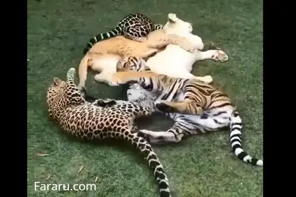 ویدئویی جالب از بازی یک ببر، یک پلنگ، توله پلنگ، شیر ماده دو دو شیر سفید در شبکههای اجتماعی پربازدید شده است.