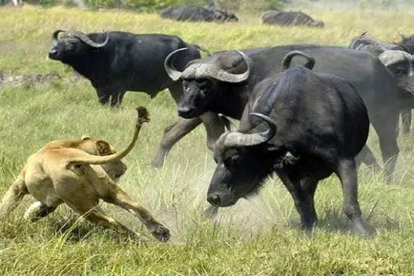 (ویدئو) شکار موفقیتآمیز گاو وحشی توسط شیر گرسنه