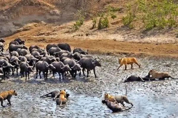 (ویدئو) نبرد دراماتیک گله شیرها با گله بوفالوها