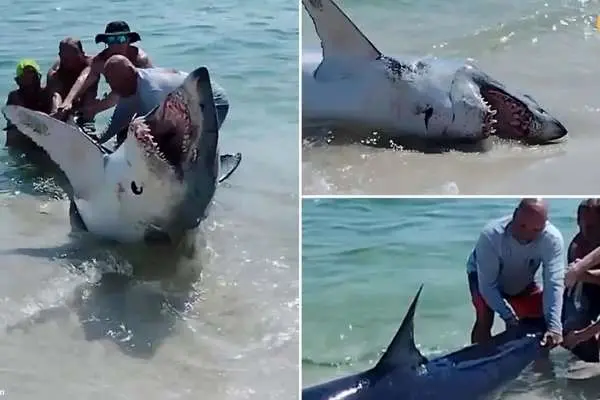 به گزارش فرارو، در ویدئویی از این صحنه دراماتیک که توسط یک زن ضبط شده، همسرش و چند مرد دیگر برای بازگرداندن کوسه به داخل آب با یکدیگر همکاری کردند.