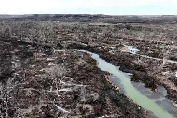 تصویر گرفته شده با پهپاد، بر فراز شهرستان «همفیل» در تگزاس، روز دوشنبه (۴ مارس) میزان خسارت‌های به جا مانده از آتش‌سوزی گسترده‌ای را که یک هفته پیش آغاز شد و علفزار‌های حاصلخیز را به خاکستر بدل کرد، نشان می‌دهد.