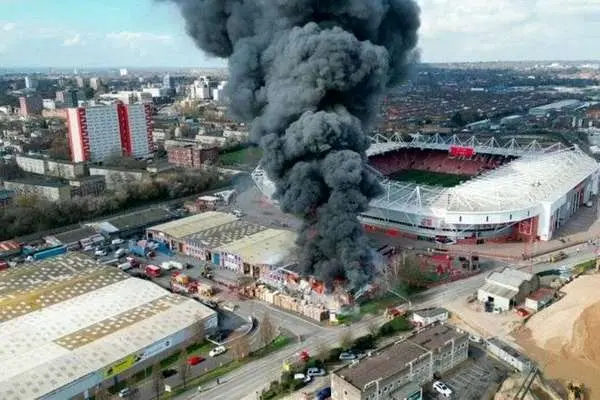 وقوع آتش سوزی در یک ساختمان صنعتی مجاور این ورزشگاه، موجب بلند شدن دود سیاه غلیظی شد. بیش از ۱۰۰ آتش نشان برای خاموش کردن آتش تلاش میکنند. از تلفات احتمالی این حادثه گزارشی منتشر نشده است و علت این آتش سوزی نیز اعلام نشده است.