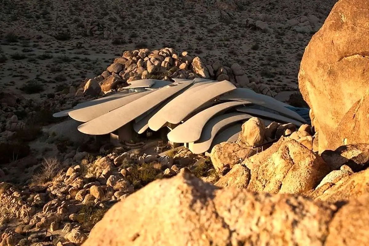 از فاصله دور، شکل ارگانیک این خانه را میتوان به اسکلت یک هیولای بیابانی تشبیه کرد که استخوانهای آن از میان مجموعه بزرگی از تختهسنگها بیرون زدهاند.