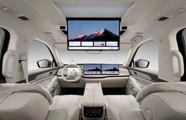 روی سقف و برای سرنشینهای ردیف دوم و سوم یک نمایشگر تاشو بسیار بزرگ یا بهتر بگوئیم تلویزیون در نظر گرفته شده تا این کابین فضائی متفاوت با دیگر محصولات کلاس خود داشته باشد.