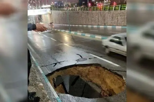 تصویری از فرونشست زیرگذر میدان امام حسین (ع) واقع در هسته مرکزی شهر یزد که بهدلیل بارش شدید باران در فضای مجازی وایرال شده است.