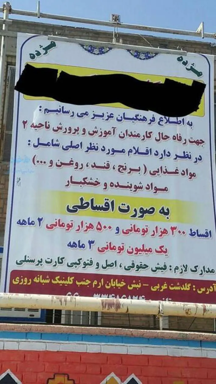 در بنری از خرید قسطی گوشت در دیوارهای این مناطق به چشم میخورد؛ چیزی که در هیچکدام از تبلیغات مناطق بالای تهران به چشم نمیخورد و همین به شرایط اقتصادی پایین شهر اشاره دارد.