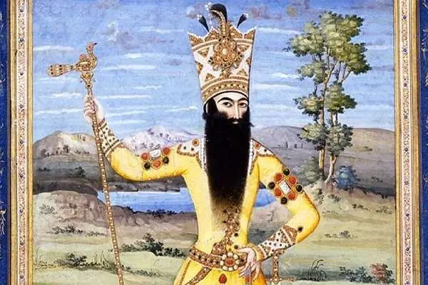 شاه کت سادهای از پارچه ارغوانی با دگمههایی از الماس پوشیده بود؛ زین ابزار اسبش از طلای خالص بود شمشیرش ساده بود و کلاهی شبیه کلاه غلامانش بر سر داشت. حدود ده قدم عقبتر از او دو نفر - قلیان دار و جامه دارش - میآمدند خرقه یا ردای او از پارچه ضخیمی بود که در ایران بگرس» خوانده میشود؛ رنگ آن قرمز بود و هیچ فرقی با چوکه بارون اعلای معمولی نداشت، غیر از دگمههای طلای زیبایش درست جلوی دسته اول، بیرق ابریشمین بزرگی حمل میشد به رنگ سبز که در وسط آن شیر و خورشیدی نقش بسته بود این بیرق ظاهراً در میان نقاره خانه شاه یا گروه موزیک نظامی حمل میشد و دو بیرق ابریشمین سبزرنگ دیگر هم در دو سوی آن بود