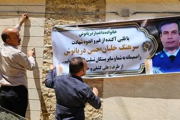 تصویری غمانگیز از پدر خلبان محسن دریانوش هنگام دیدن بنر نصبشده پسرش روی دیوار منزل را مشاهده میکنید.
