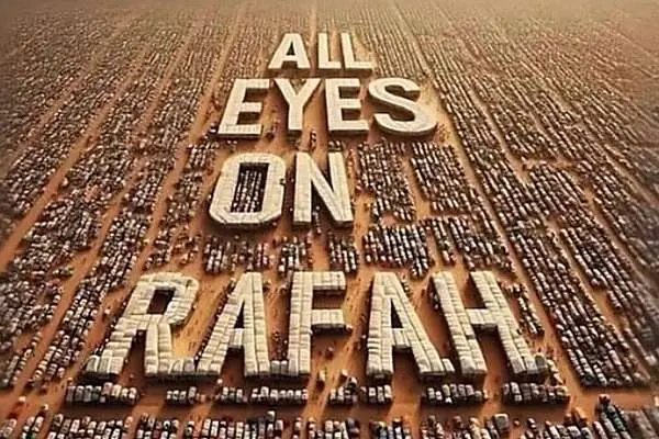 در این تصویر چادرهای پناهجویان به شکلی قرار گرفته که عبارت تمام نگاهها به رفح (All eyes on Rafah) را نشان میدهند. رفح منطقهای در جنوب غزه مملو از چادرهای پناهجویان است. مقامات محلی اعلام کردند پس از حمله رژیم صهیونیستی در روز یک شنبه، حداقل ۴۵ نفر در این منطقه کشته شده اند.